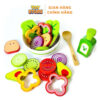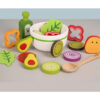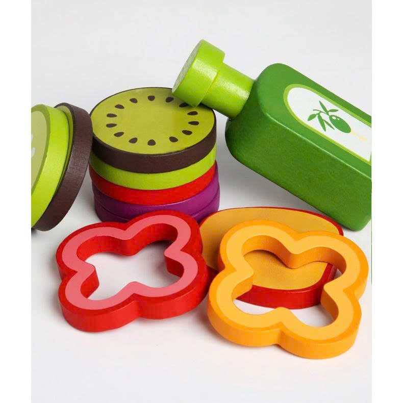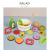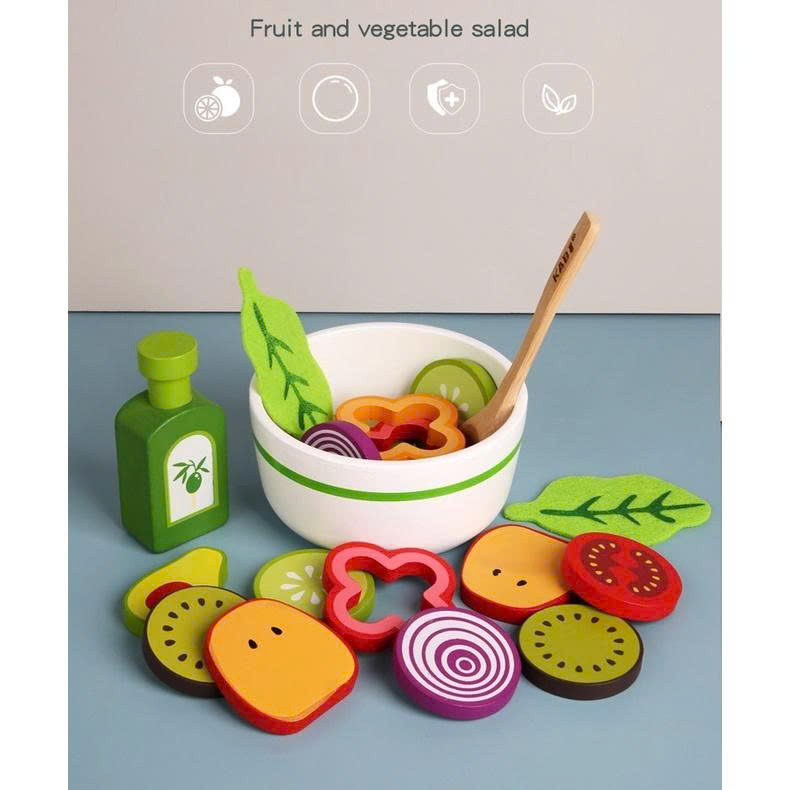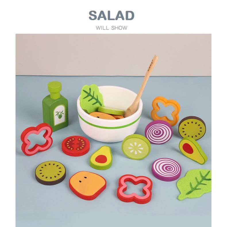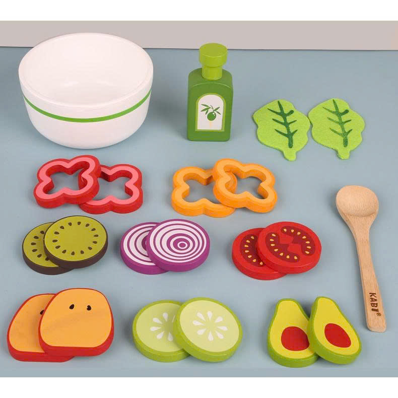 – Bộ bát salad gồm rau củ cắt lát và gia vị, sẽ cho bé thực hành làm thức ăn như trong nhà bếp của nhà.