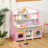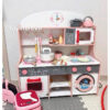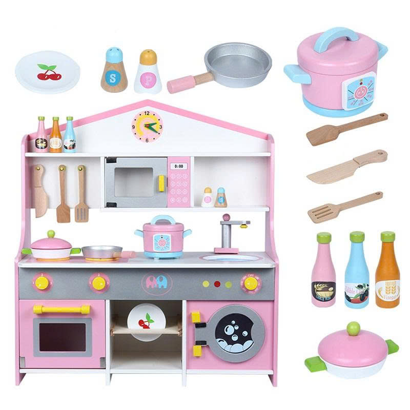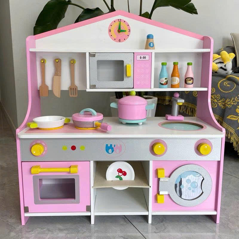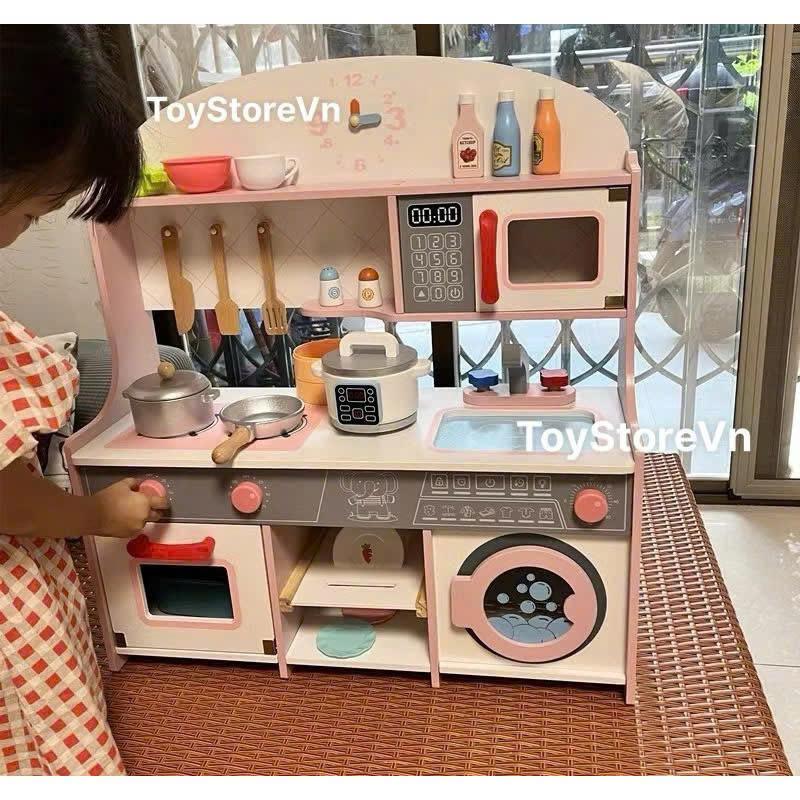 – Bộ đồ chơi bàn bếp nấu ăn bao gồm: xoong, chảo, đĩa, gia vị, dụng cụ nhà bếp, bồn rửa và còn tích hợp thêm lò nướng và máy giặt, chạn bát … mô phỏng như thật được làm bằng gỗ cao cấp