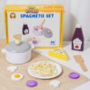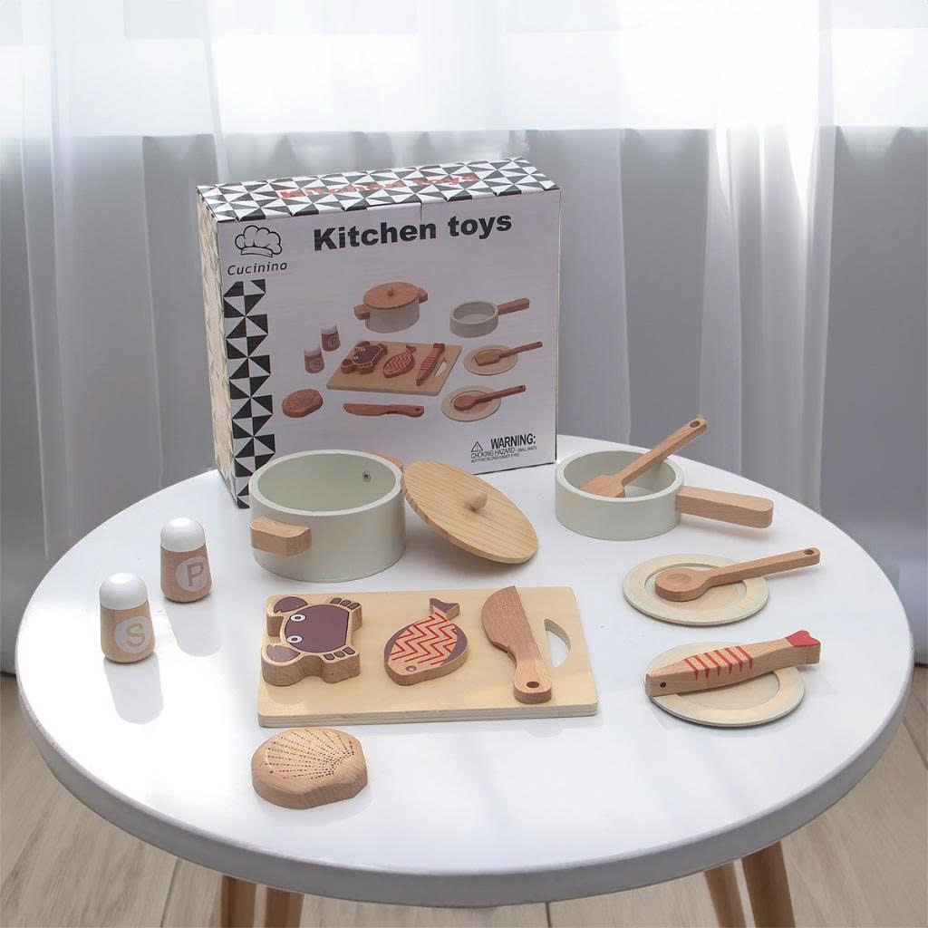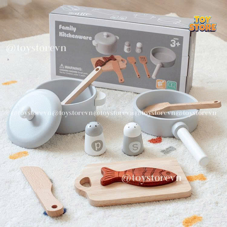 – Bộ nồi chảo và dụng cụ nấu ăn với nồi, chảo, dao, muỗng, thìa và gia vị, sẽ cho bé thực hành làm thức ăn như trong nhà bếp của nhà.