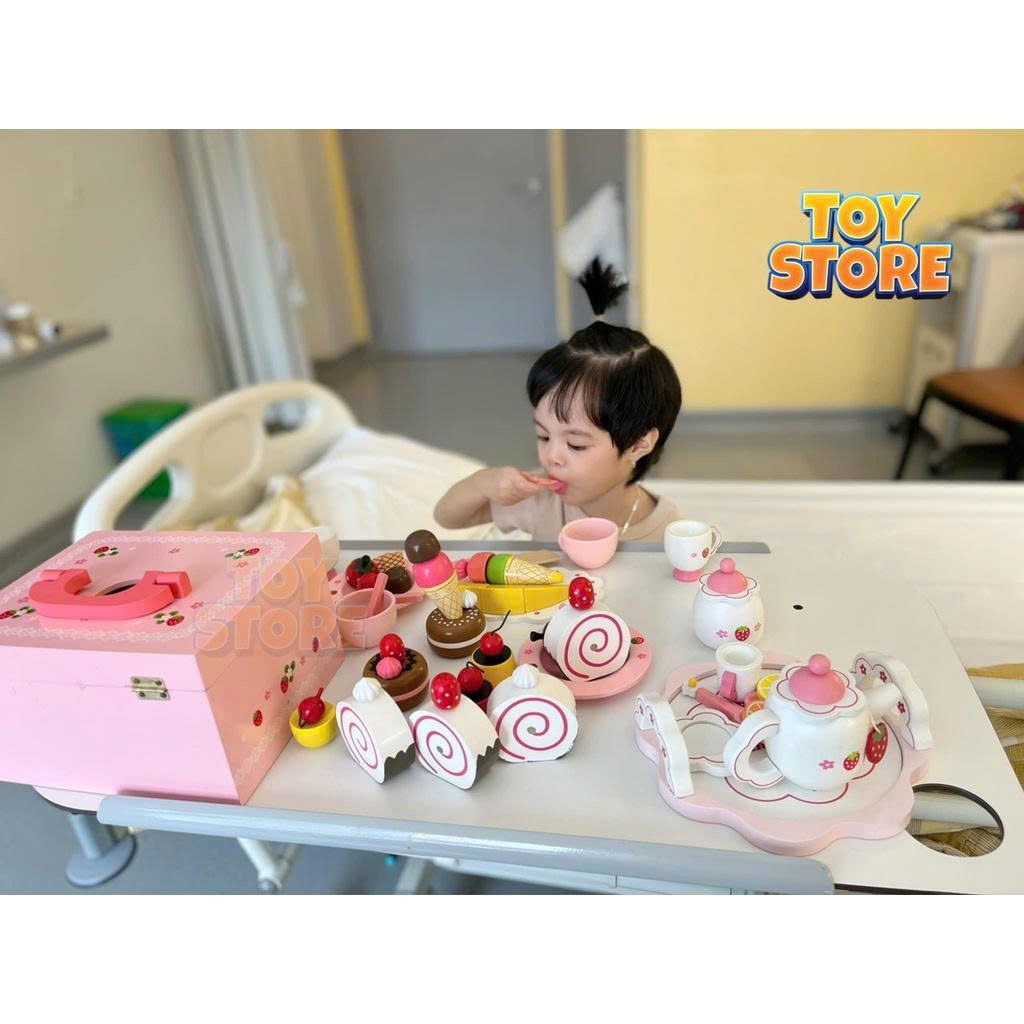 – Trong giai đoạn mẫu giáo này, bố mẹ hãy cố gắng tìm kiếm những chủ đề, những hoạt cảnh và cả những công cụ để giúp cho trò chơi “giả vờ” của bé được sinh động và thú vị hơn nhé. Bộ đồ chơi tiệc trà bánh họa tiết dâu tây này là một trong những công cụ tuyệt vời để bố mẹ cùng bé chơi trò chơi và có những giây phút thư giãn thoải mái