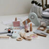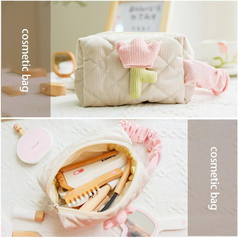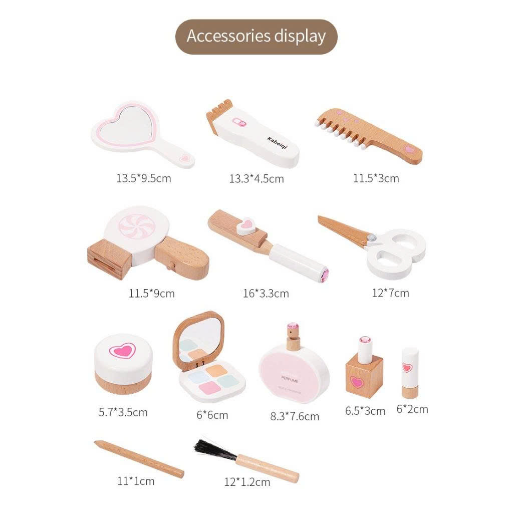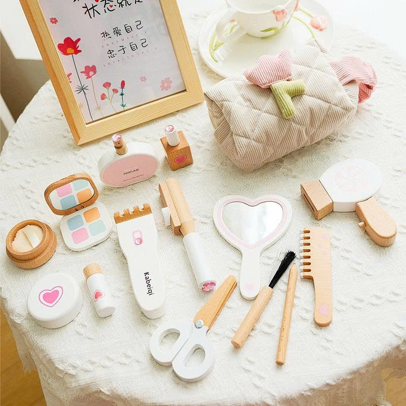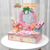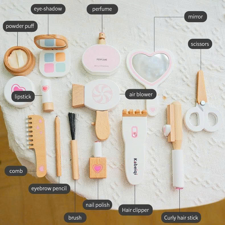 – Các món đồ make up, skincare như: phấn mắt, sơn móng tay, phấn má, son môi, nước hoa, bông tẩy trang, máy sấy tóc, máy uốn tóc được mô phỏng như thật với tone màu chủ đạo là màu hồng xinh xắn được các bé vô cùng yêu thích